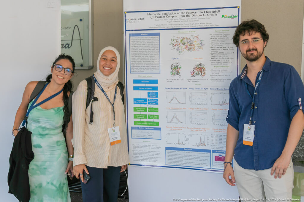 Researchers from the Photocam group team up building new connections and exchanging ideas that will benefit our current and future investigations. Our Doctoral Candidates actively participated in both presentations and poster sessions. Gregor Hill presnted his latest results on “Molecular Determinants of the Mechanism of Action of PsbS under the Computational Microscope” while Boutheina Zender discussed the results on “Computational insights into the dynamic interactions of FCP-LHCX1 complexes in Diatoms”. Regarding the poster session one of our members proudly won the prize for Best Poster!